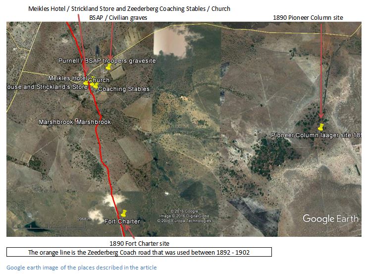 Dunne was succeeded by Arthur Strickland, who married Jeannie Meikle. Jessie M. Lloyd says they were at Charter only for the period 1892-1893, but Cormac Lloyd’s researches revealed the Strickland’s were still managing the Hotel and Store in 1896 and Arthur Strickland was in command of the laager during the 1896 Mashona Rebellion, or First Chimurenga. A newspaper account in the Rhodesia Herald of Wednesday 16 July 1896 written by Dan Judson states quite categorically that the laager was sited at the Hotel and Strickland’s Store and is quoted in full in the accompanying article on Fort Charter in the website www.zimfieldguide.com