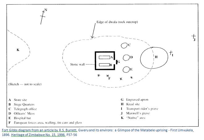 On 30th April, scouts of Colonel Beal’s relief force from Salisbury reached a local store about 1.5 kilometres north of Makalika kop that had been looted and destroyed and then saw from Makalika kop an Ndebele Impi of about 500 warriors on a kopje a kilometre south west. This kopje with late Iron-Age Zimbabwe period walling and fortification was the likely source of stone for Fort Gibbs. The Impi advanced to the base of Makalika kop and forced the scouts retreat before they were reinforced by some 40 mounted troopers of Beal’s force and drove the Matabele off. Colonel Beal’s forces moved onto Gwelo which they reached on 2nd May.