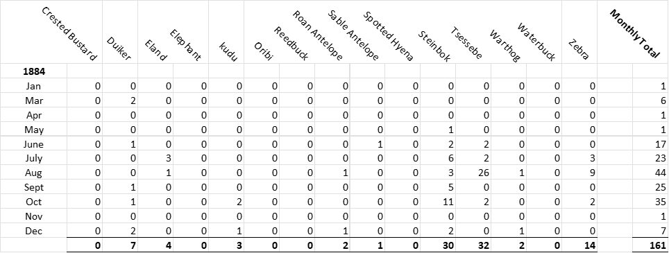 From one end of the original game book that Selous kept between these years are daily details of the animals he shot and until 1880 even their location. In 1881 he missed the winter hunting season as he travelled to England. The daily count continues again from 1882, but without locations being noted and stops after the first few months of 1885 – although he continued to collect game specimens for museums.