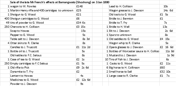 A general sale of French’s effects were made at Shoshong; Selous kept an accurate record of what was sold and what was paid or owed in his game book.[xl]