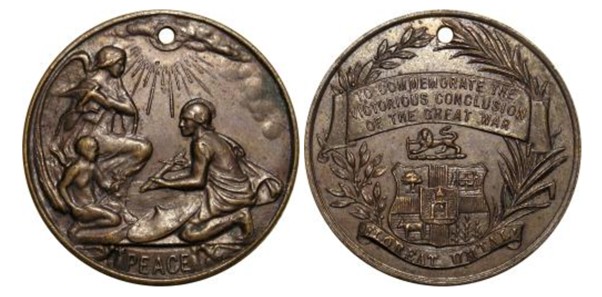 Reverse; Within a wreath of Laurel (left) and a palm frond (right) the coat of arms of Umtali with lion Crest and motto: FLOREAT UMTALI. Superimposed above, a banner: TO COMMEMORATE THE VICTORIOUS CONCLUSION OF THE GREAT WAR