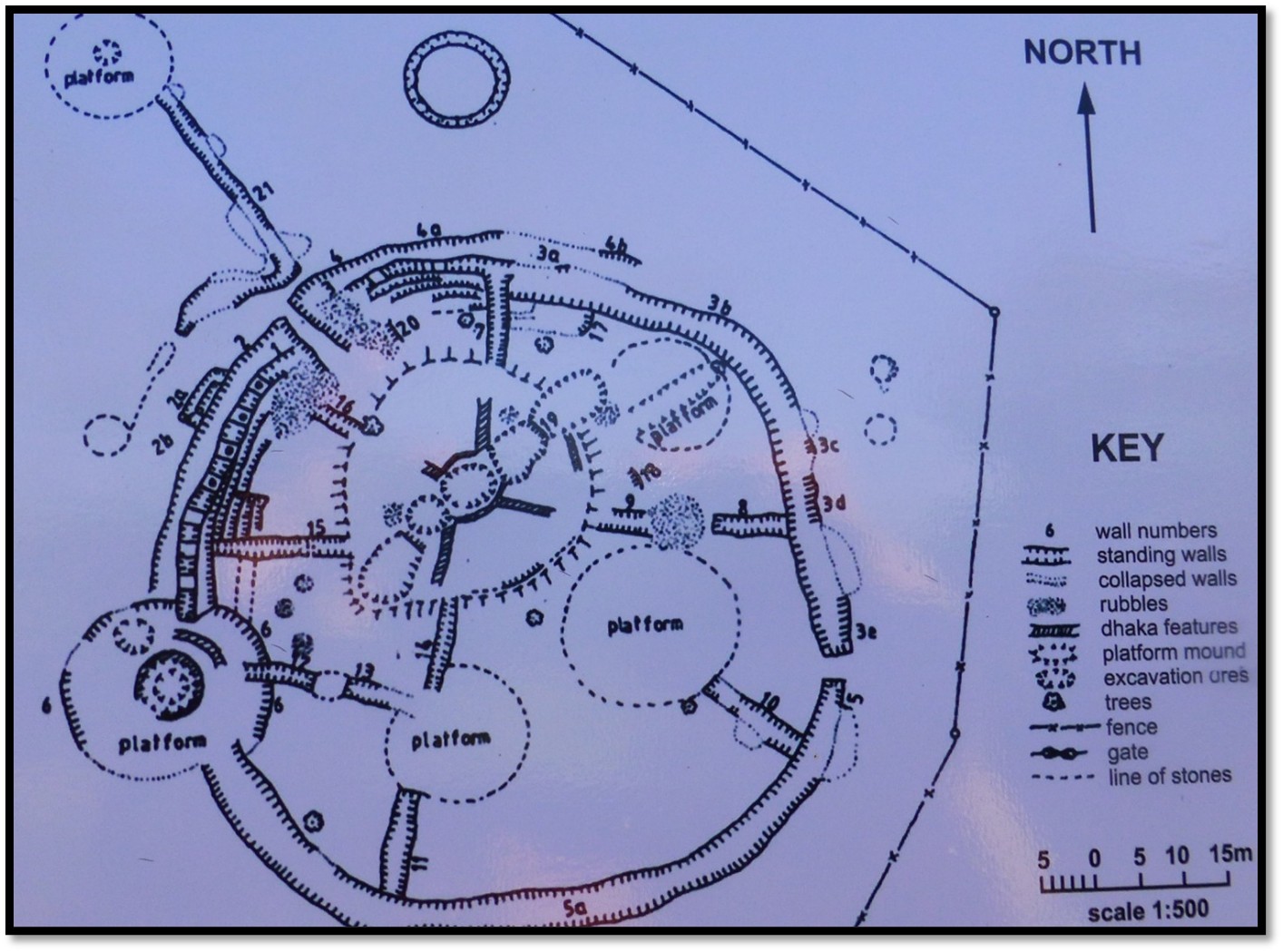 The main structure is an oval-shaped enclosure with a maximum diameter of 53 metres built of dry-stone walling divided into seven internal spaces radiating from the centre which has a central platform 2.5 metres high which was used by the ruler, probably a sub-chief, as his residence. The walls are generally 2 – 2.5 metres high and vary from 1 – 3 metres in width. There are two entrances to the enclosure.