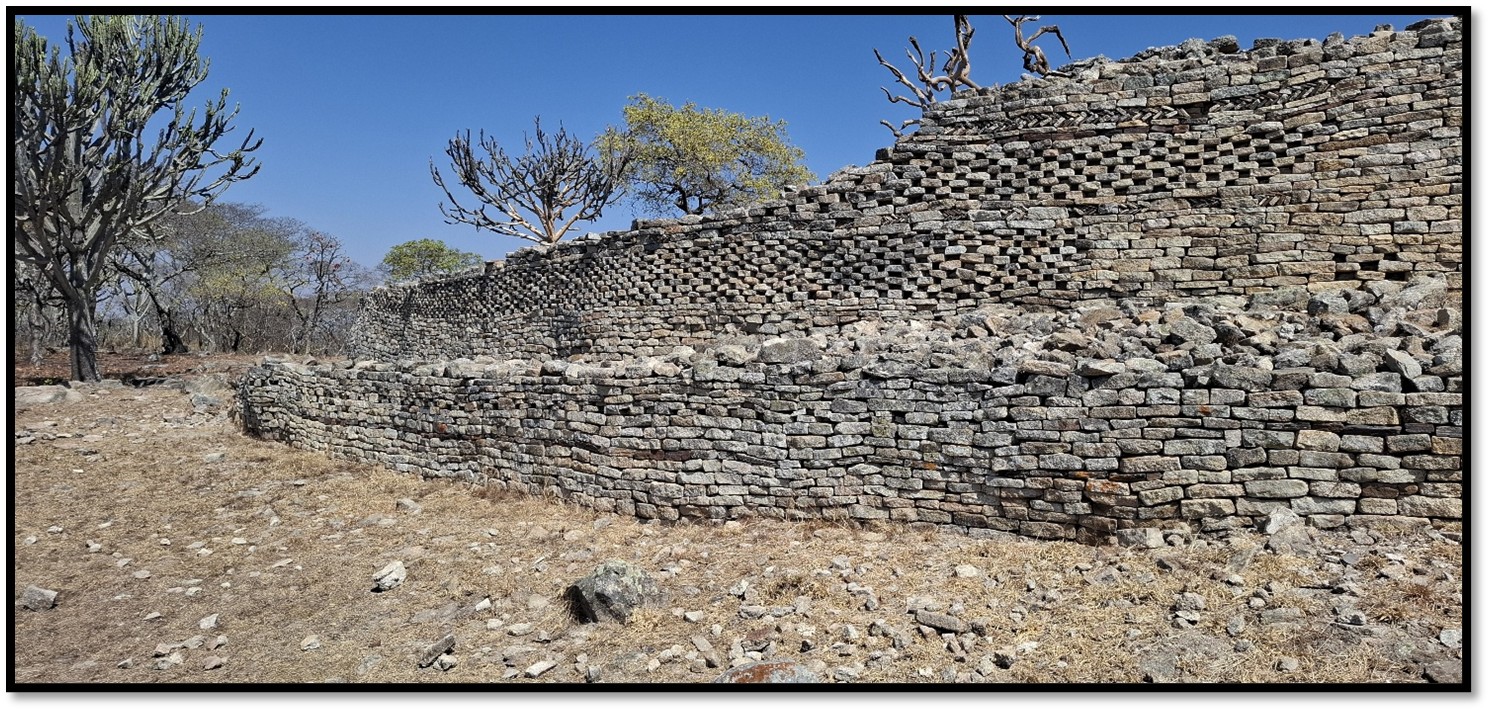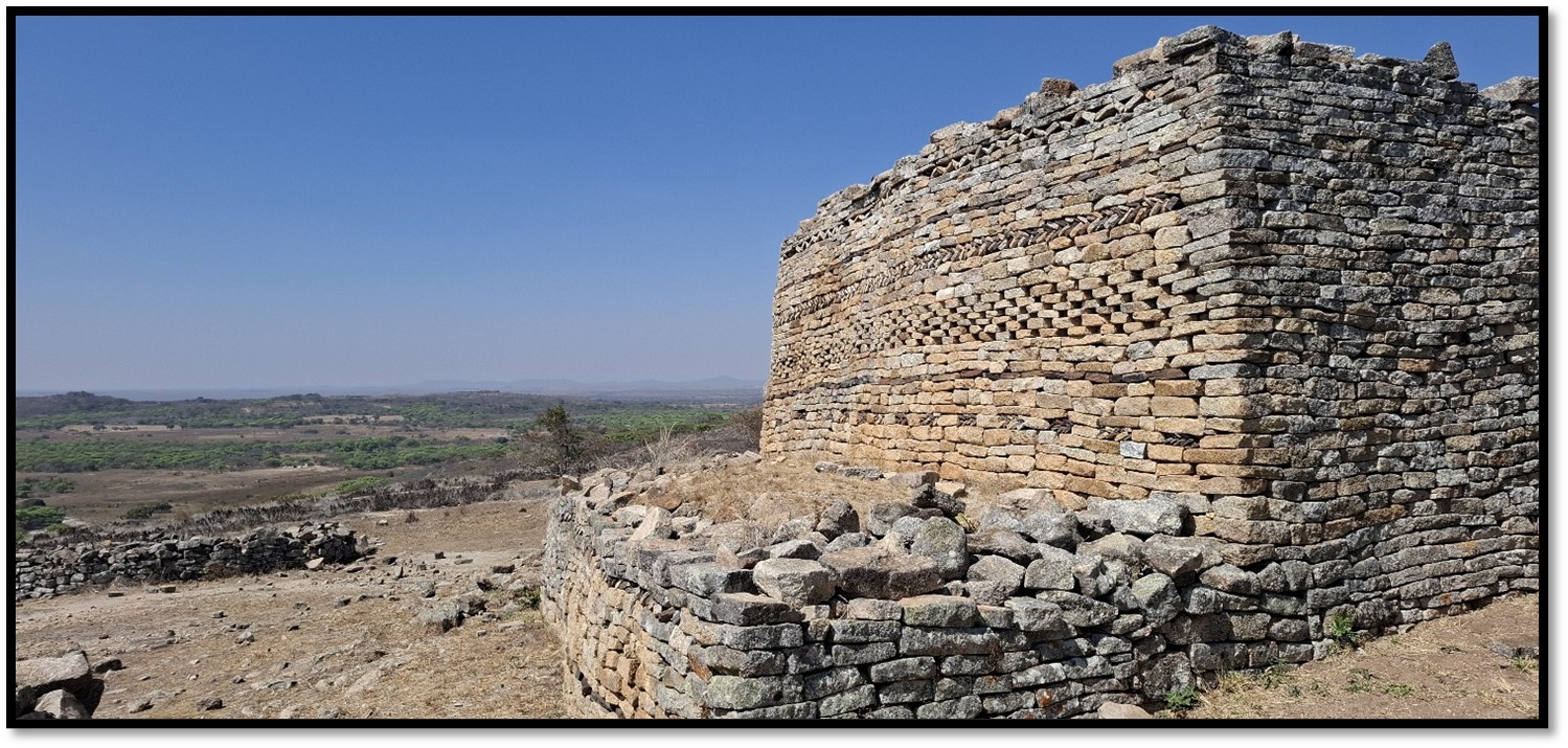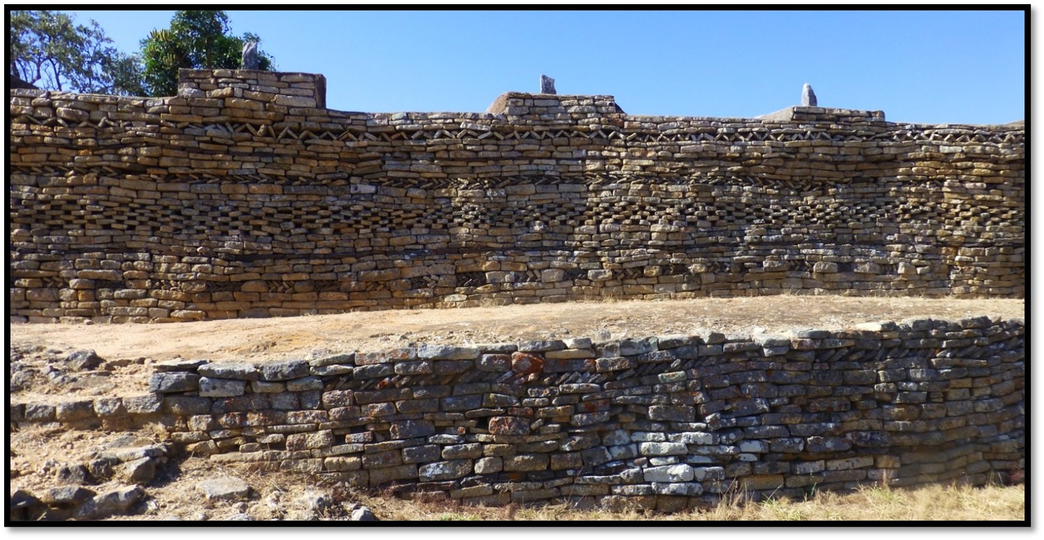 Following the decline of Great Zimbabwe in the 1480’s the Torwa State (Torwa means “strangers” according to Portuguese documents) rose to prominence and the building of Khame commenced in the late fifteenth century and Danan’ombe in the sixteenth century, before the Torwa rulers moved their capital to Naletale in the seventeenth century. Naletale may also have acted as an outlying retreat for the rulers at Danan’ombe and for the purposes of collecting tribute from vassals within the surrounding districts. All these places have the same architectural style of creating terraces within surrounding walls, always built in tiers which needed to be level in order to support the wall decoration (Type 4 platform complexes according to Roger Summers’ classification)